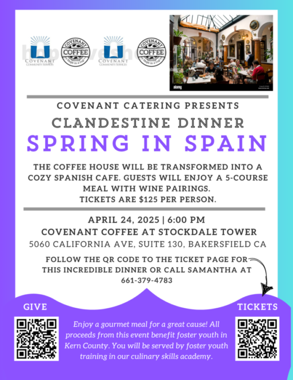 Spain in Spring – A Clandestine DinnerApril 24th | 6:00–9:00 PM | Covenant Coffee, Stockdale Towers Experience a 5-course Spanish-inspired dinner with fine wine pairings,...