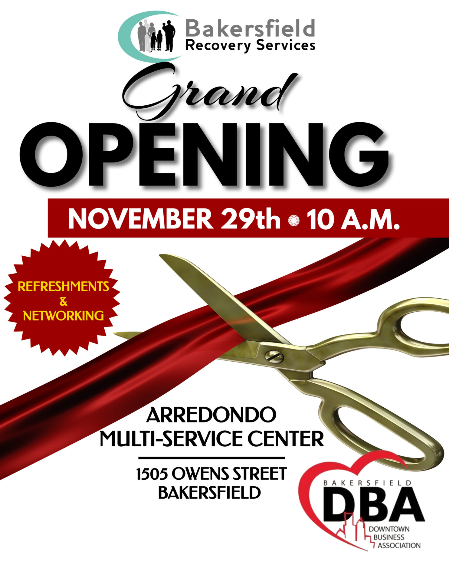 Join Bakersfield Recovery Services Arredondo Multi-Service Center Grand Opening Date: November 29, 2023 at 10 AM Location: 1505 Owens Street Bakersfield, CA