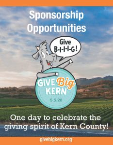 Here’s your chance to support Kern County’s ENTIRE nonprofit sector all at once by sponsoring Kern Community Foundation’s Online Day of Giving, Give Big Kern: One Day to Celebrate the Giving Spirit of Kern County!—winner of the 2019 Beautiful Bakersfield Award for helping to create “A Better Bakersfield.”
