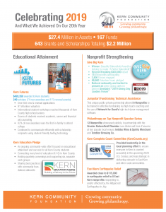 In an effort to be transparent in all we do, Kern Community Foundation publishes an “Impact Sheet” during the first quarter of the year, detailing the previous year’s accomplishments in our two strategic initiatives, Educational Attainment and Nonprofit Strengthening. Our 2019 Impact Sheet is hot off the presses, and we think you will agree that our 20th Anniversary Year was one of many accomplishments, which are victories shared with all our fund holders, donors, supporters, partners and friends. Thank you! Click on the image to access a downloadable PDF copy.