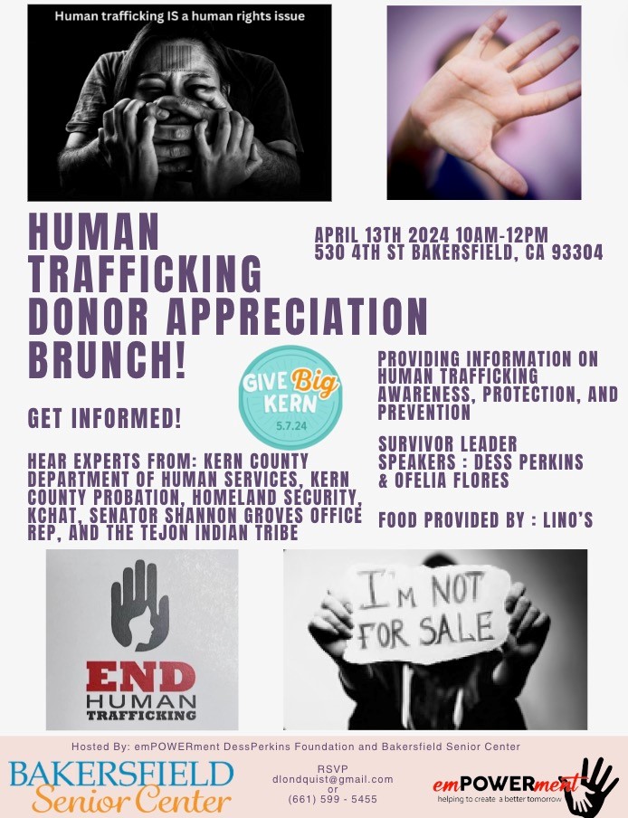Join emPOWERment DessPerkins Foundation & Bakersfield Senior Center as they host the Human Trafficking Donor Appreciation Brunch on April 13, 2024, from 10 AM – 12 PM.