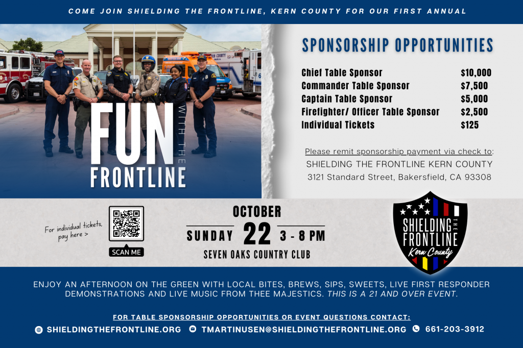 Please join Shielding the Frontline, Kern County, on Sunday, October 22, 2023, as we host Fun with the Frontline, supporting our Kern County frontline emergency responders dedicated to protecting and serving our community. This one-of-a-kind outdoor event will be held at Seven Oaks Country Club. Attendees will enjoy tastings from local food and beverage purveyors donating their time and talents, along with live demonstrations from various first responder agencies, music, and dancing with Thee Majestics- so be sure to bring your dancing shoes! This is a 21-and-over event.