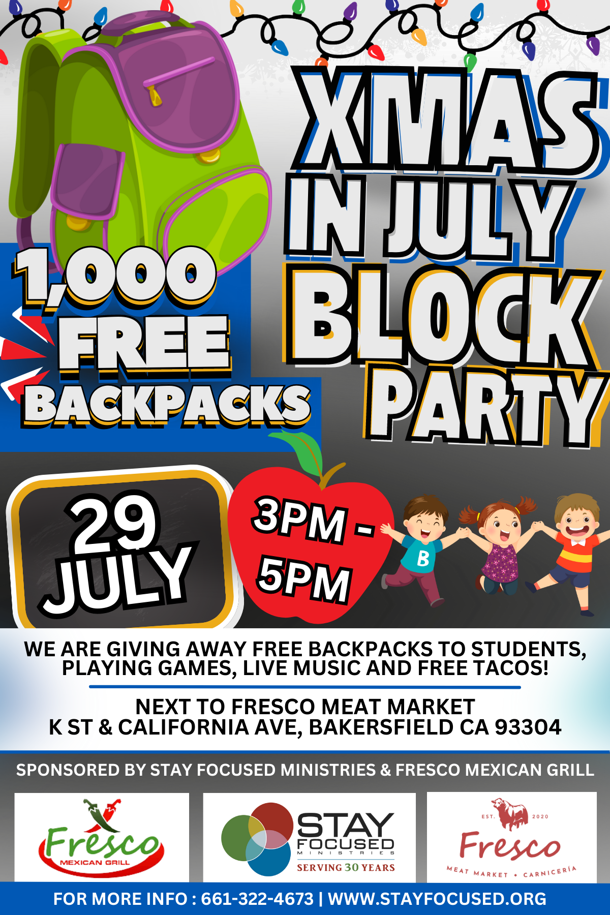 We are excited to announce our upcoming Backpack Drive & Block Party, hosted by Stay Focused Ministries and Fresco Mexican Grill & Meat Market, on July 29th, 2023.