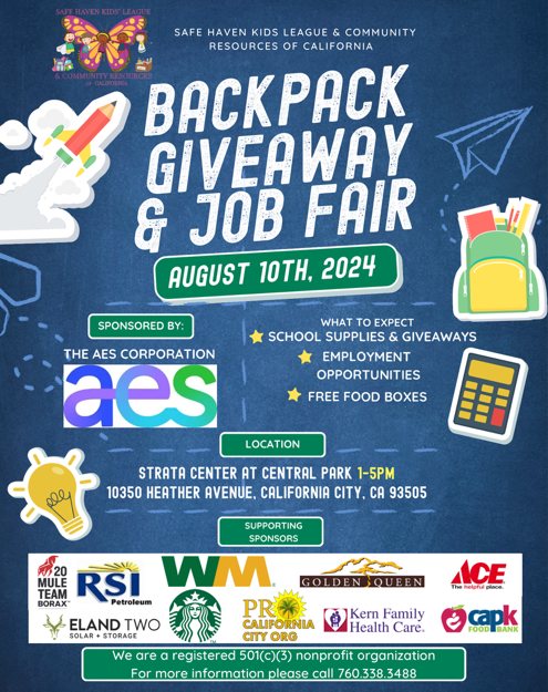 Safe Haven Kids League of California City: Back 2 School Backpack Job Fair & Community Resource Giveaway